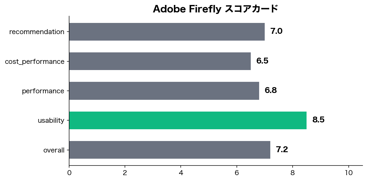 競合との差別化ポイントは「商用利用の安心感」と「Creative Cloud連携」。純粋な性能勝負では厳しいが、企業ユーザーには刺さる価値提案だ。