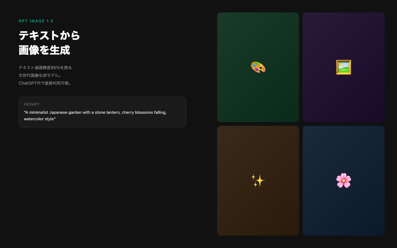 - +GPT Image 1.5の画像生成は約95%のテキスト描画精度で実務レベルに到達
