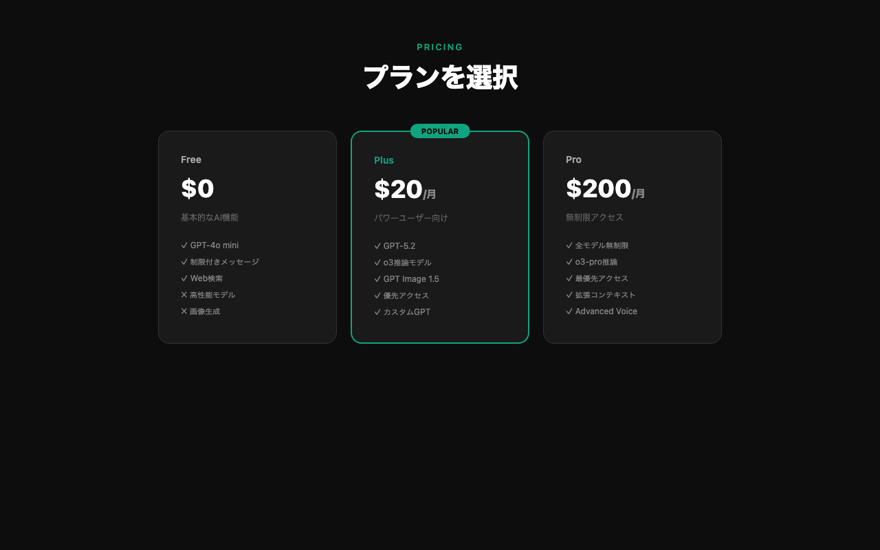 まずは無料プランで1週間試し、1日10回以上使うようならPlusに切り替えるのが最もコスパの良い始め方。Proプランはo3を業務で毎日使う人だけが検討すればよい。