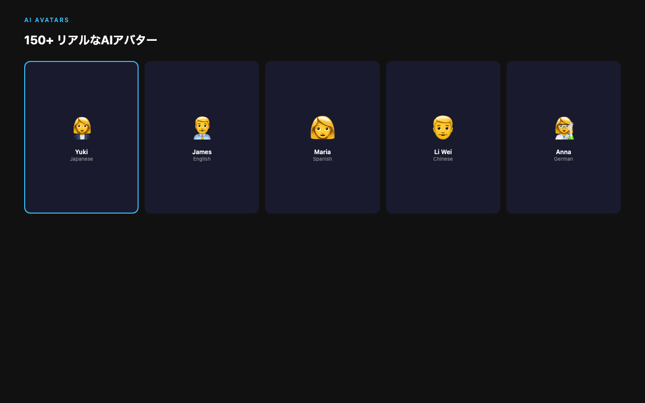| AIアバター数 | 150+ | 230+ | 100+ | 写真から生成 |