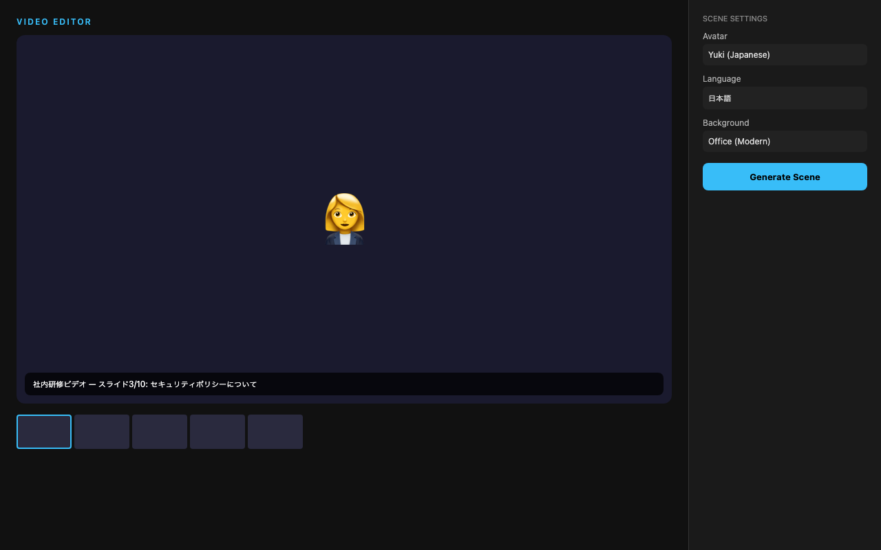Colossyanのエディタは、動画編集ソフトを使ったことがない人事担当者でも直感的に操作できるよう設計されている。ログイン後のダッシュボードから「新規動画作成」をクリックすると、テンプレート選択画面が表示される。研修動画、プロダクトデモ、社内連絡など、用途別に数十種類のテンプレートが用意されており、そこから選ぶだけでスライド構成の雛形ができあがる。 エディタ画面はスライドベースのUIで、PowerPointに慣れている人なら違和感なく操作できる。左側にスライド一覧、中央にプレビュー、右側にアバター設定とテキスト入力欄というレイアウトだ。各スライドにテキストを入力し、アバターを選択して「生成」ボタンを押すだけで、アバターがそのテキストを読み上げる動画が生成される。 特に便利だったのが、PowerPoint/PDFからの動画変換機能だ。既存の研修用スライドをアップロードすると、各スライドに対応するシーンが自動で作成され、ノートに書いた台本がそのままナレーションとして読み込まれる。過去3年分の研修資料をすべてAI動画化できる可能性が見えた瞬間だった。 ただし日本語フォントの選択肢が少なく、テキストオーバーレイのデザイン自由度は低い。企業ロゴの配置やブランドカラーの設定はできるが、凝ったアニメーションやトランジションは期待しない方がいい。あくまで「情報伝達のための動画」を効率的に作るツールであり、クリエイティブな映像制作には向かない。