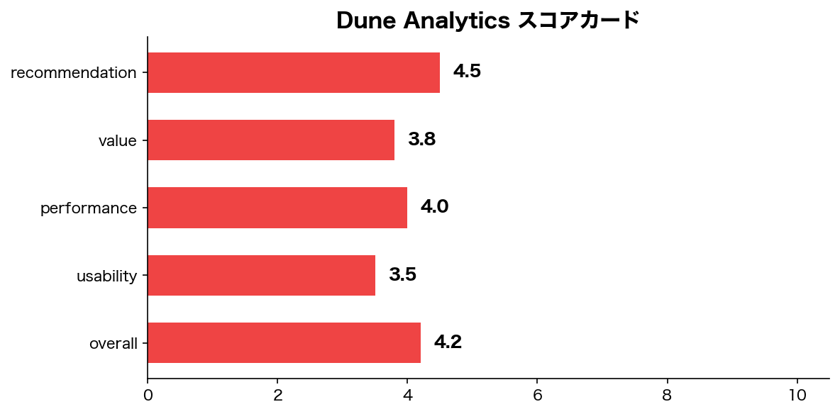 Dune Analyticsは、オンチェーンデータ分析の最高峰ツールとして確固たる地位を築いている。SQLによる完全な分析自由度と、コミュニティが構築した膨大なダッシュボード資産は他では得られない価値だ。最近のAI機能追加により初心者の参入障壁も下がったが、依然として中級者以上向けのツール。月額$349という料金は個人投資家には高額だが、本格的なDeFi・NFT投資を行う人やファンド運用者なら十分にペイする投資と言える。競合他社にはない「何でも分析できる」柔軟性こそが最大の魅力。投資判断で差別化を図りたい人には必須レベルのプラットフォームだ。