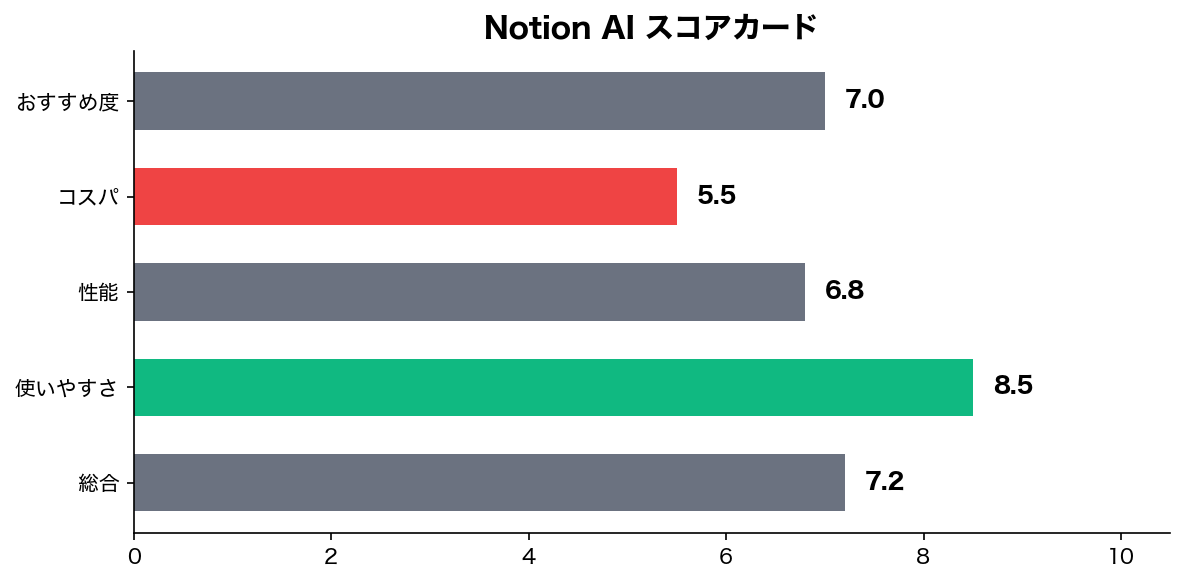 | Notion AI | $10(+Notion料金) | あり | 7/10 | Notionのみ |